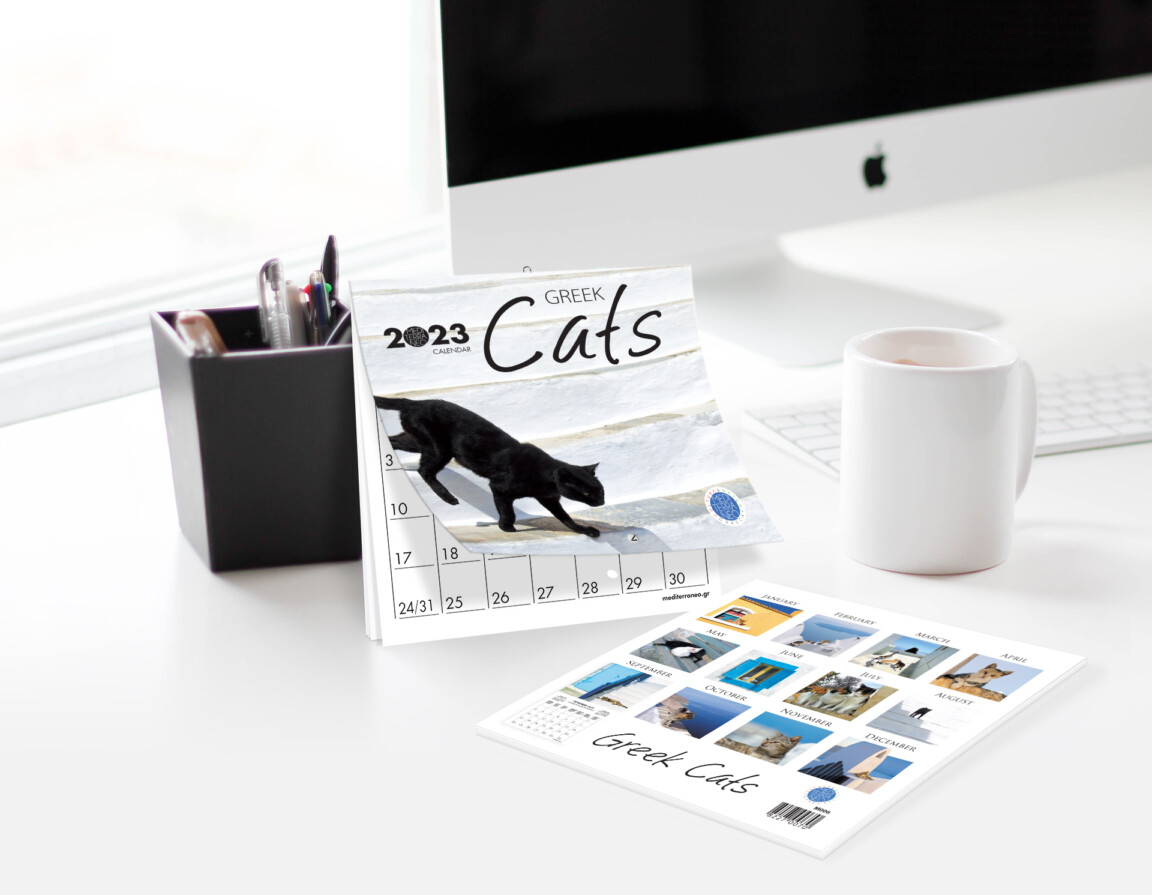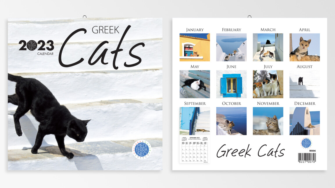 Ημερολόγιο τοίχου εικονογραφημένο με φωτογραφίες από χαριτωμένες γάτες που τριγυρνούν στους δρόμους της Ελλάδας.